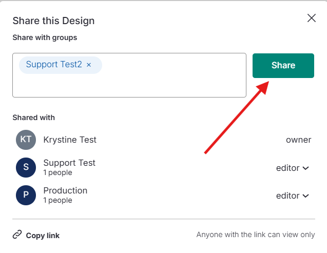 Une fois la fenêtre ouverte, vous pouvez choisir de partager votre design avec des Groupes ou de copier un lien de partage.
