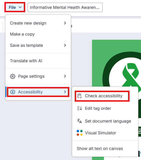 Cliquez sur File dans la barre d’outils supérieure, sélectionnez Accessibility, puis cliquez sur Check accessibility.