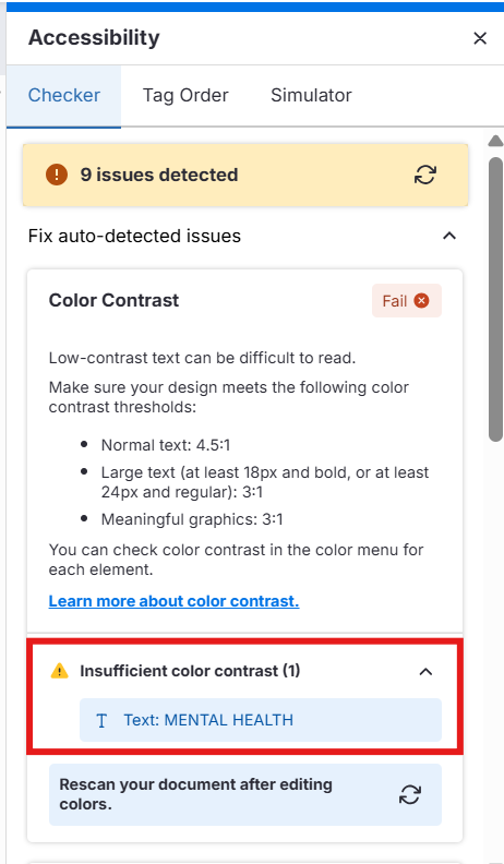 Après avoir effectué vos modifications, cliquez sur « Rescan Document » dans le panneau Accessibility pour vérifier vos mises à jour et confirmer que votre design respecte les normes d’accessibilité.