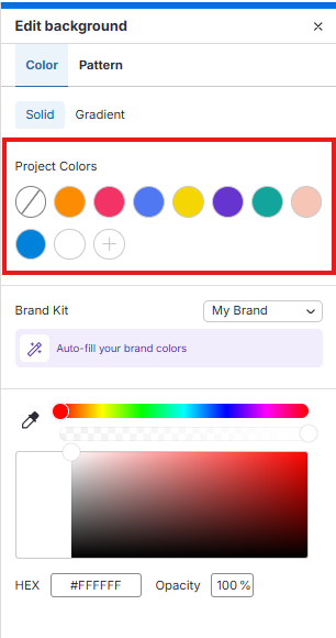 Se você adicionou cores da marca ao seu Brand Kit, elas também aparecerão aqui. Selecione uma para manter seu design alinhado à identidade da sua marca.