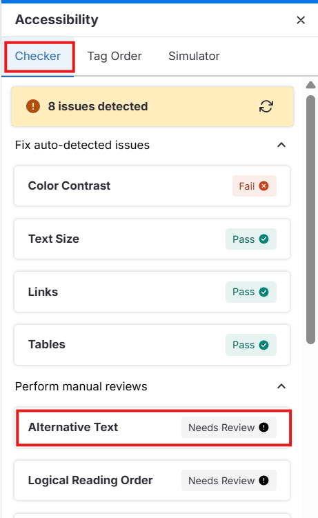 O Verificador destacará todos os elementos não textuais e sinalizará qualquer alt text ausente.