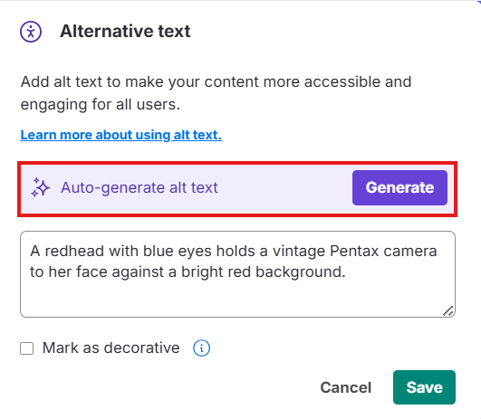 Gerar alt text automaticamente — Clique em Generate para que o Venngage crie uma descrição automática para você. Você pode editar ou melhorar o texto gerado antes de salvar.