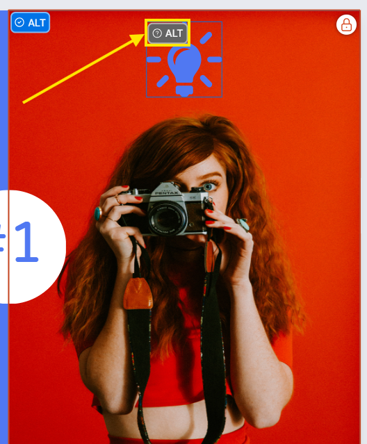 Elementos sem texto alternativo aparecem com uma etiqueta “ALT” cinza (azul quando concluído).