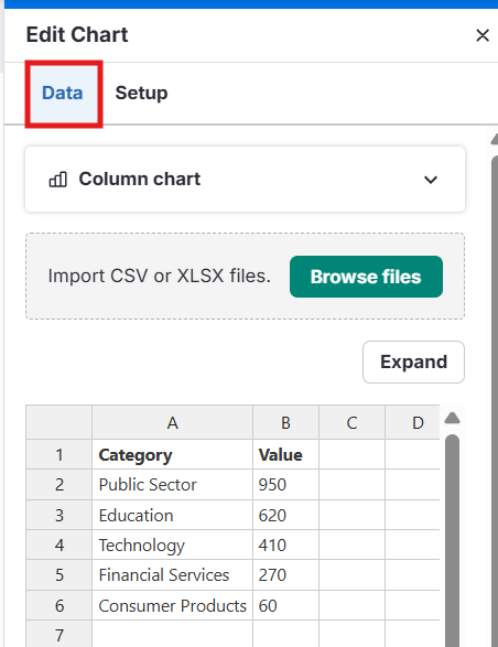 .csvou.xlsxno seu dispositivoOs dados serão importados automaticamente para a planilha do gráfico