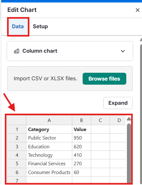 Cole diretamente na planilha do gráfico no Venngage (CTRL+V / CMD+V)