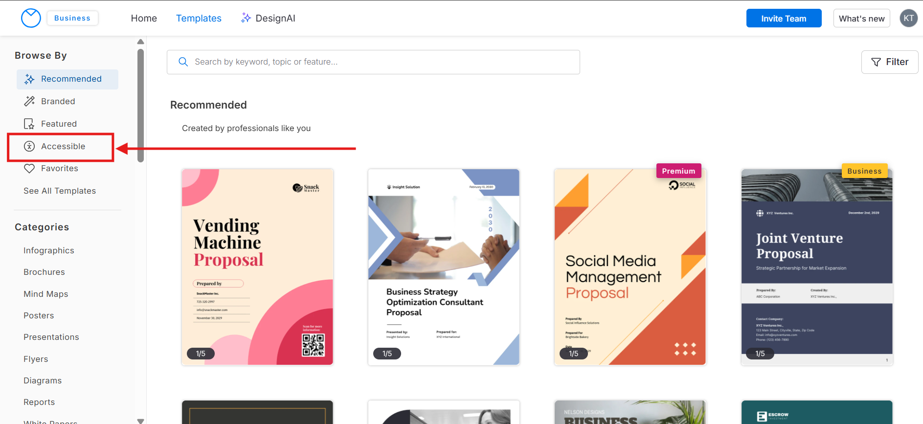 Pesquise "designs acessíveis" ou clique na categoria "Acessível" em "Procurar por" na barra lateral esquerda da página Modelos .
