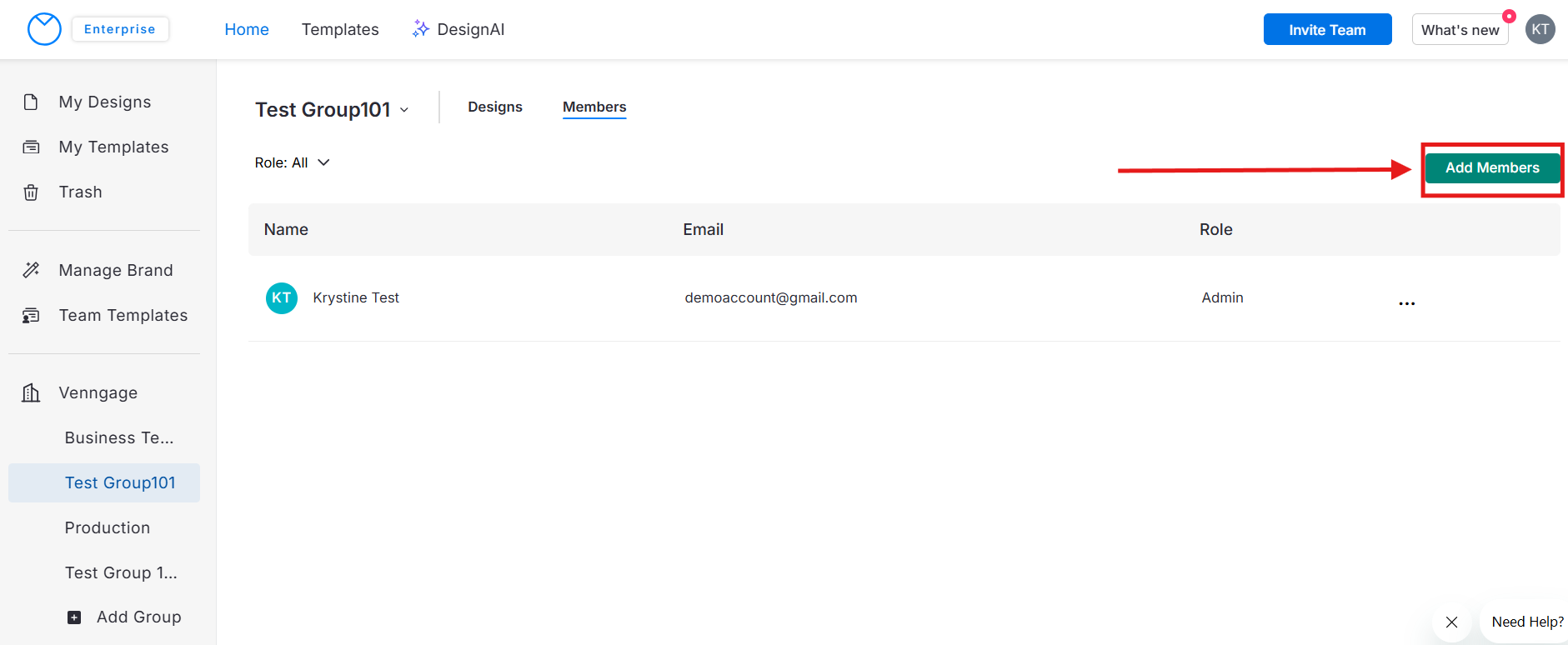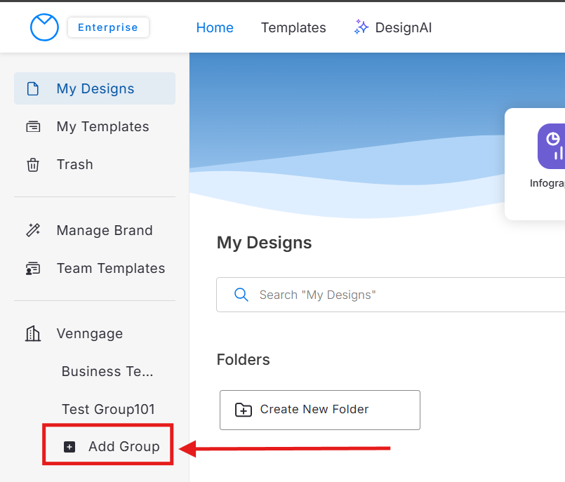 Você encontrará seus Grupos na barra lateral esquerda da página inicial da Venngage — são os Grupos que você criou ou dos quais participa.