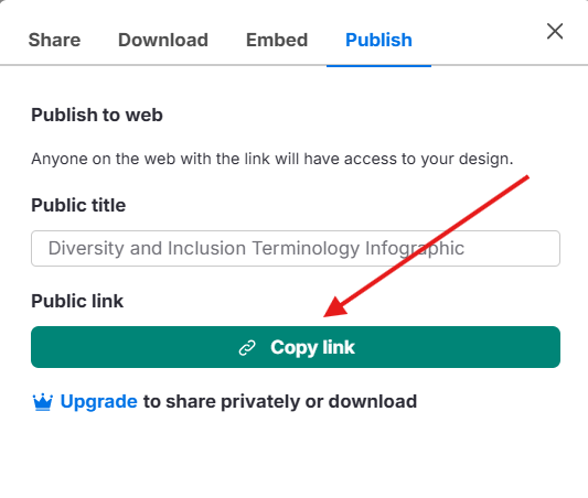 Se você estiver usando um plano gratuito da Venngage, o download dos seus designs não estará disponível. No entanto, você ainda pode compartilhar seu trabalho publicamente usando um link compartilhável.