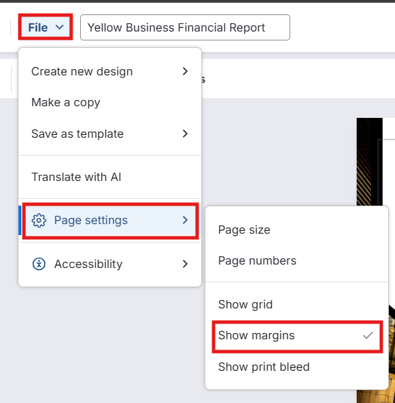 Selecione Mostrar margens (Show margins) em Configurações da página (Page settings).
