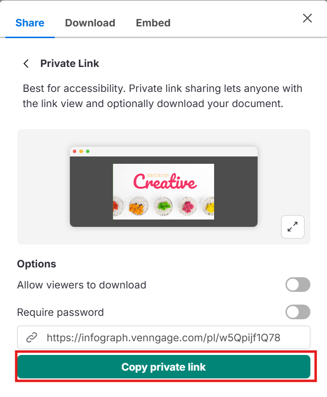 Quer compartilhar seu design sem precisar fazer download? Se você estiver em um plano Premium, Business ou Enterprise, pode gerar um link privado — perfeito para enviar seu design diretamente por e-mail ou chat.