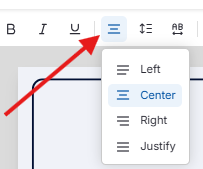 Para alterar o alinhamento, clique duas vezes no texto → abra o menu Alinhamento na barra de ferramentas.