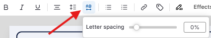 Para modificar o espaçamento entre letras, clique duas vezes no texto → abra o menu Espaçamento entre Letras na barra de ferramentas.