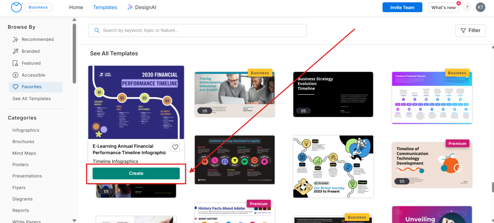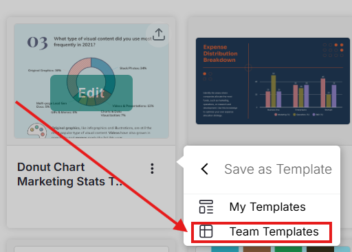 Colabore facilmente com sua equipe compartilhando modelos que todos possam usar e personalizar. Quando você salva um design em Team Templates, outros membros da sua organização podem criar sua própria cópia editável, que será automaticamente salva na página My Designs deles.