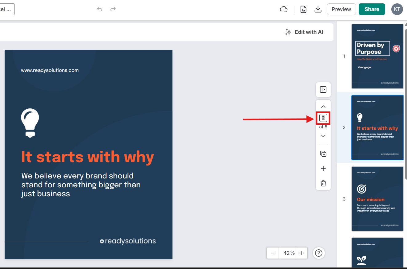 Você pode navegar entre as páginas do seu design usando a barra de ferramentas Gerenciador de Páginas, localizada no lado direito do Editor da Venngage.