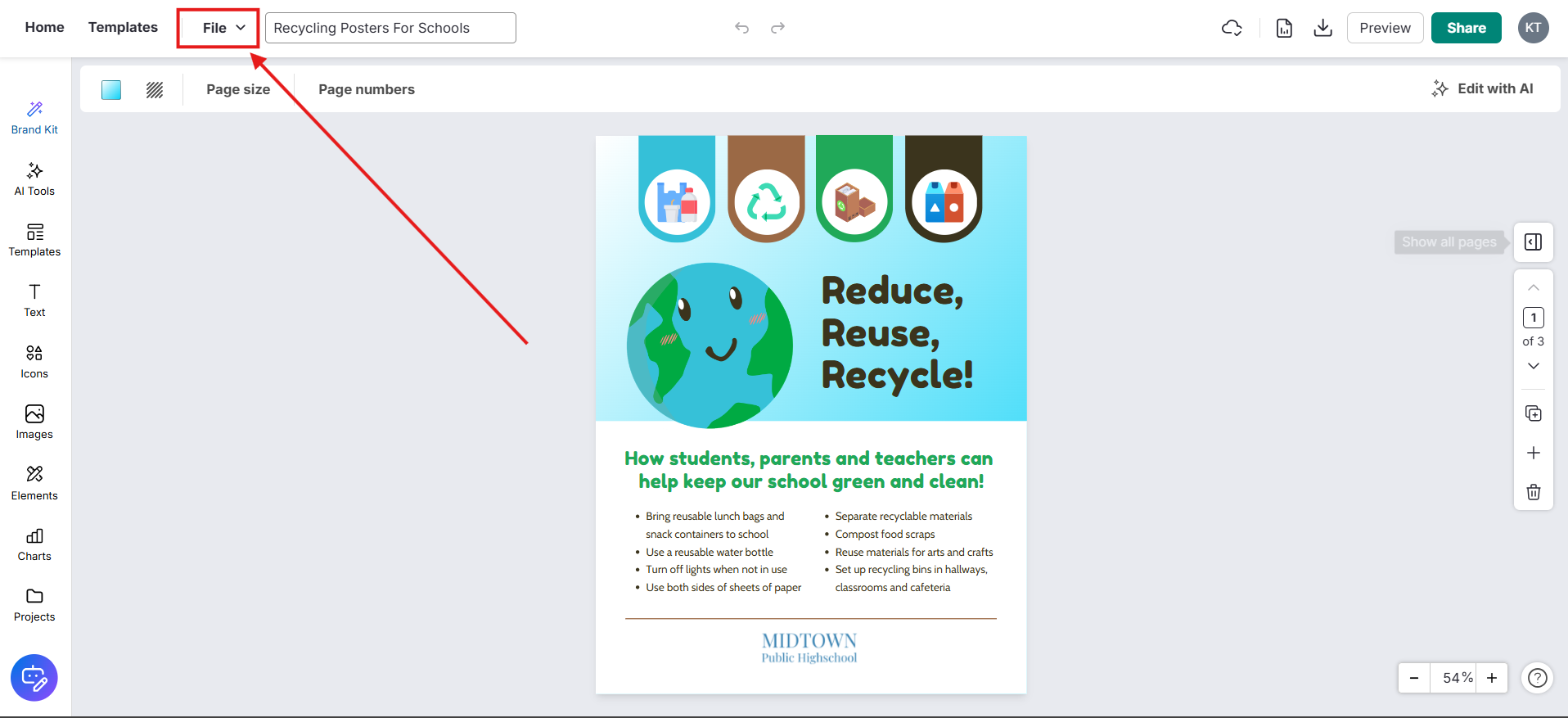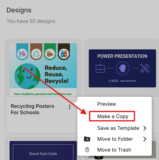 Na sua página Meus Designs, o arquivo copiado aparecerá com “Cópia -” adicionado no início do nome do arquivo (por exemplo, Cópia - Cartazes de Reciclagem para Escolas).