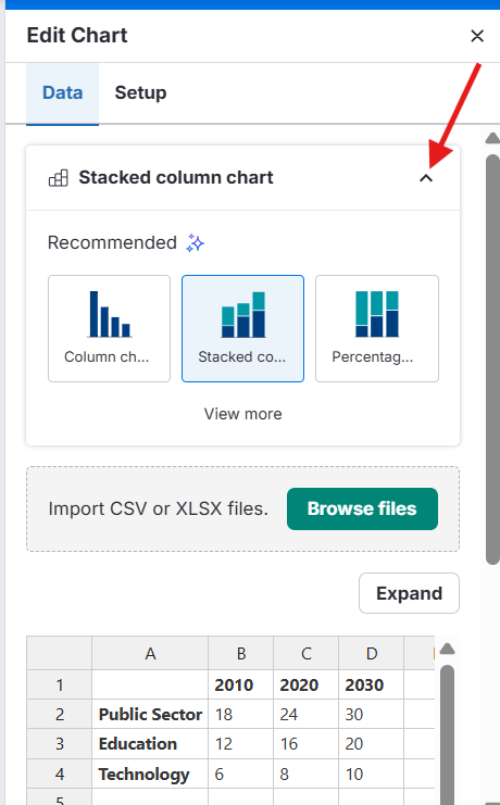 Use o menu suspenso Trocar Gráfico (Chart Swap) no painel Editar Gráfico para mudar rapidamente para outro tipo de gráfico sem perder seus dados.