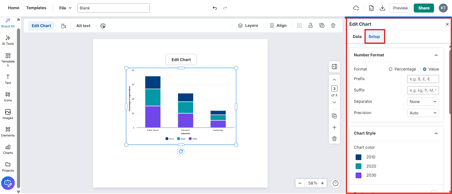 Adicione um gráfico — arraste o gráfico escolhido para o canvas ou clique nele para adicioná-lo.