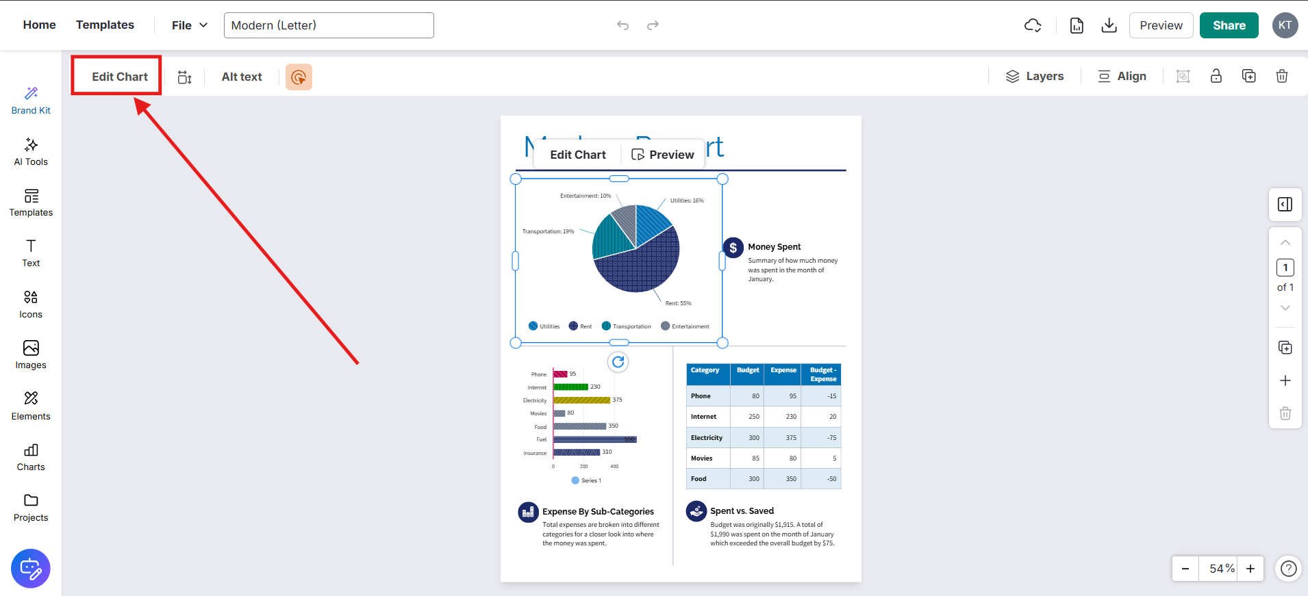 Clique no botão Editar Gráfico que aparece acima do próprio gráfico.
