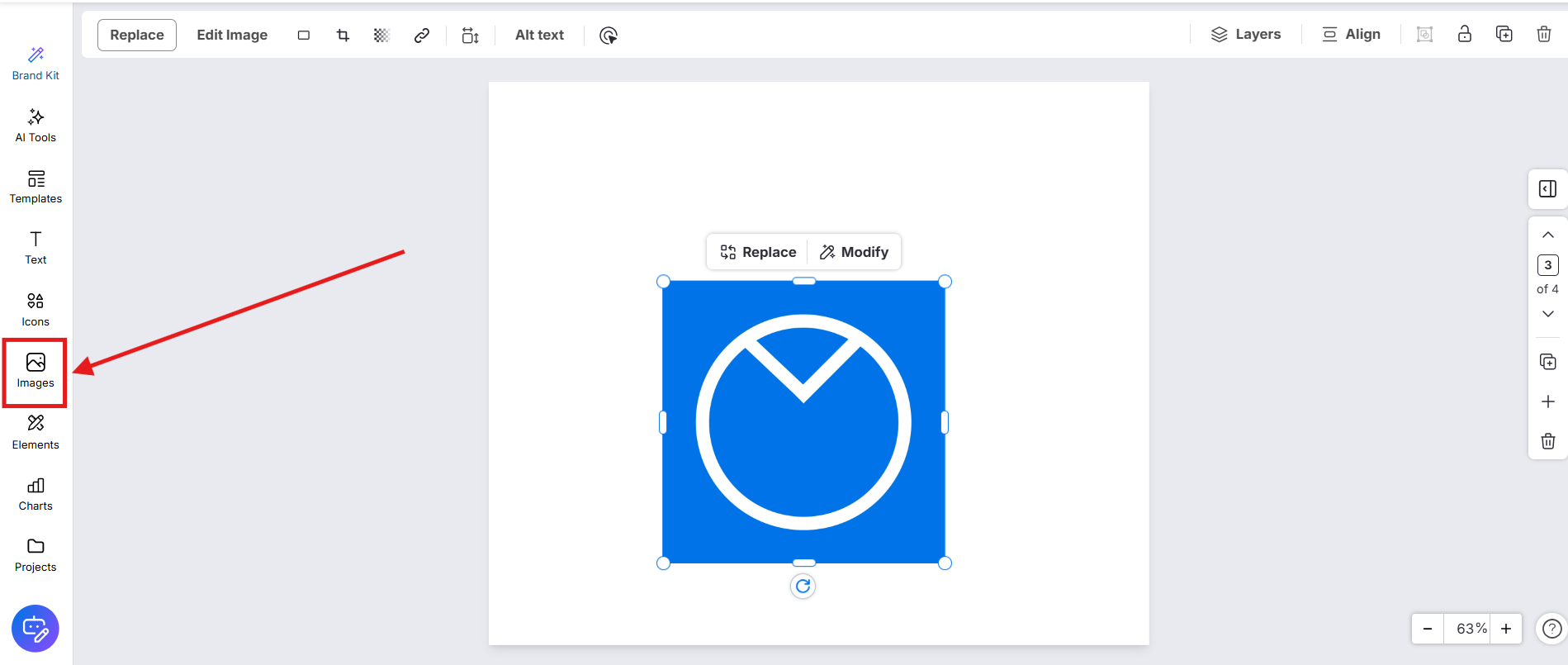 • Clique na imagem na tela e, em seguida, clique em Substituir na barra de ferramentas superior.