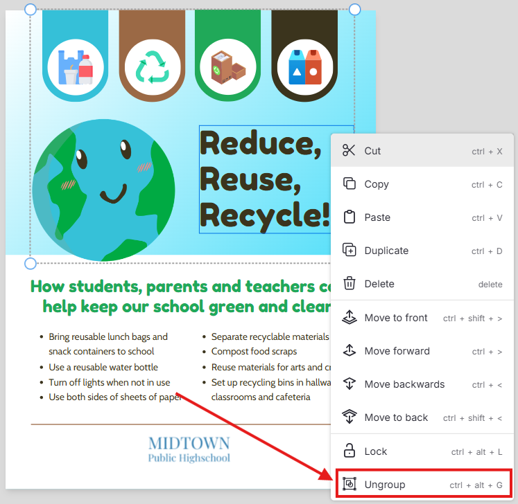 Agrupar objetos permite que você mova, redimensione e aplique estilos a vários elementos como uma única unidade, tornando mais fácil manter seu design organizado. Você sempre pode desagrupar depois, caso precise ajustar itens individuais.