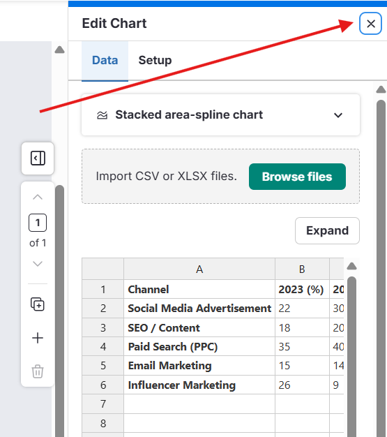 ✨ Dica: Os dados do gráfico são salvos automaticamente enquanto você edita, portanto não é preciso se preocupar em perder o progresso. Para obter melhores resultados visuais, use cores consistentes e formatação de dados uniforme em todos os gráficos do seu design.