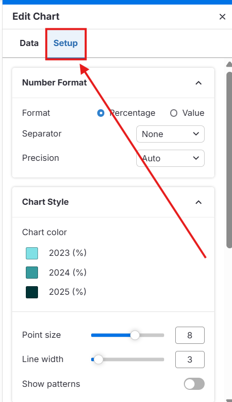 Clique duas vezes no gráfico, ou selecione-o e clique em Editar Gráfico na barra de ferramentas superior, ou clique no ícone Editar Gráfico na parte superior do gráfico.