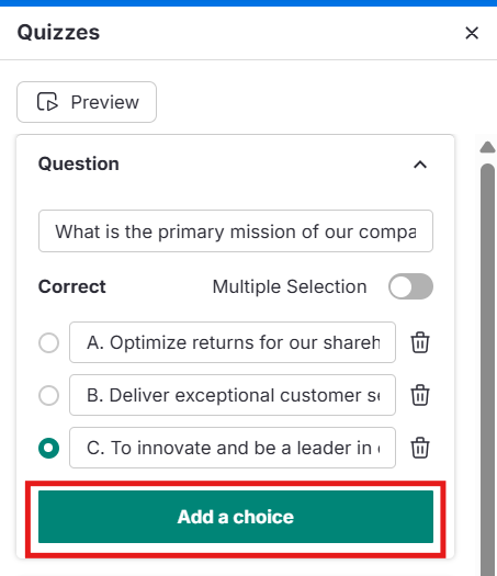 • Definir respostas corretas: Marque a caixa ao lado da(s) opção(ões) correta(s). Múltiplas respostas corretas são permitidas.