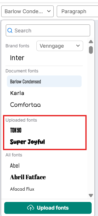 Uma vez enviada, sua fonte personalizada estará disponível dentro do Editor do Venngage na seção Fontes Enviadas.