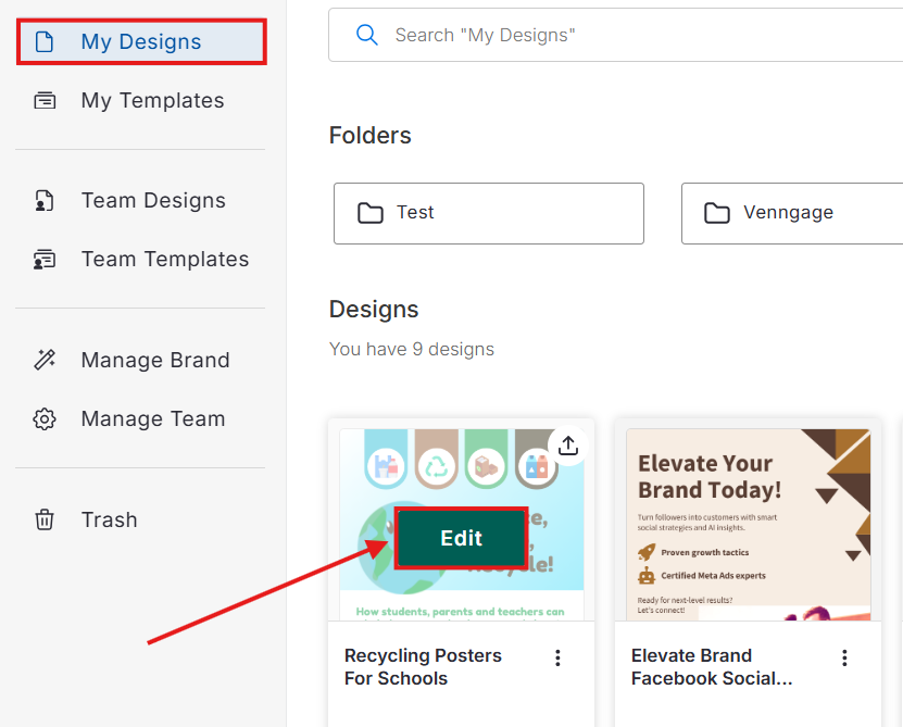 (Na página Meus Designs, role para baixo para ver todos os designs salvos. Passe o mouse sobre um design e clique em “Editar (Edit)”).