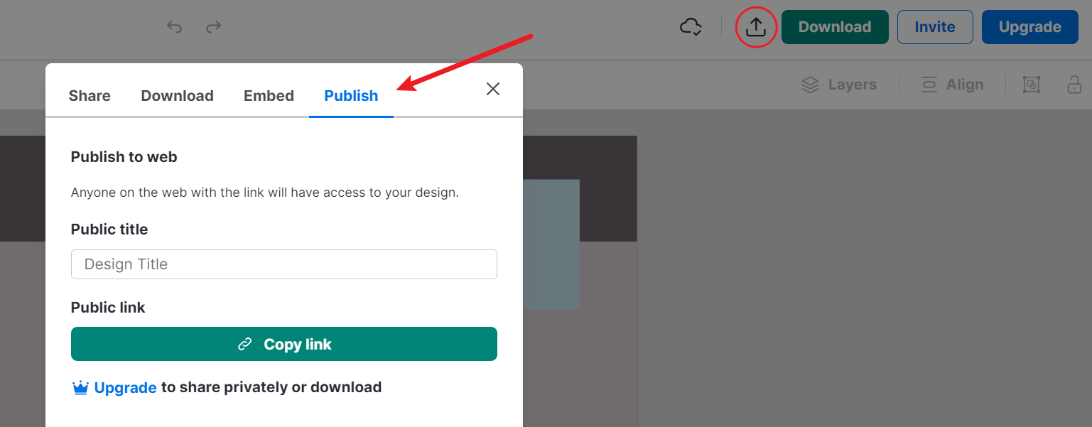 Usuários Free podem compartilhar até 5 designs publicamente usando a função Publicar na Web (Publish to Web). Usuários Free não podem baixar designs.