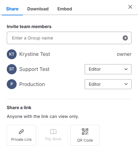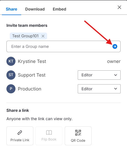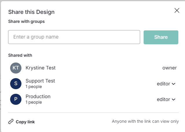 No modal Share this Design, digite o nome de um ou mais Grupos.
