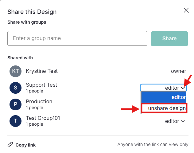 Clique na seta para baixo ao lado de “Editor” e selecione Unshare design.