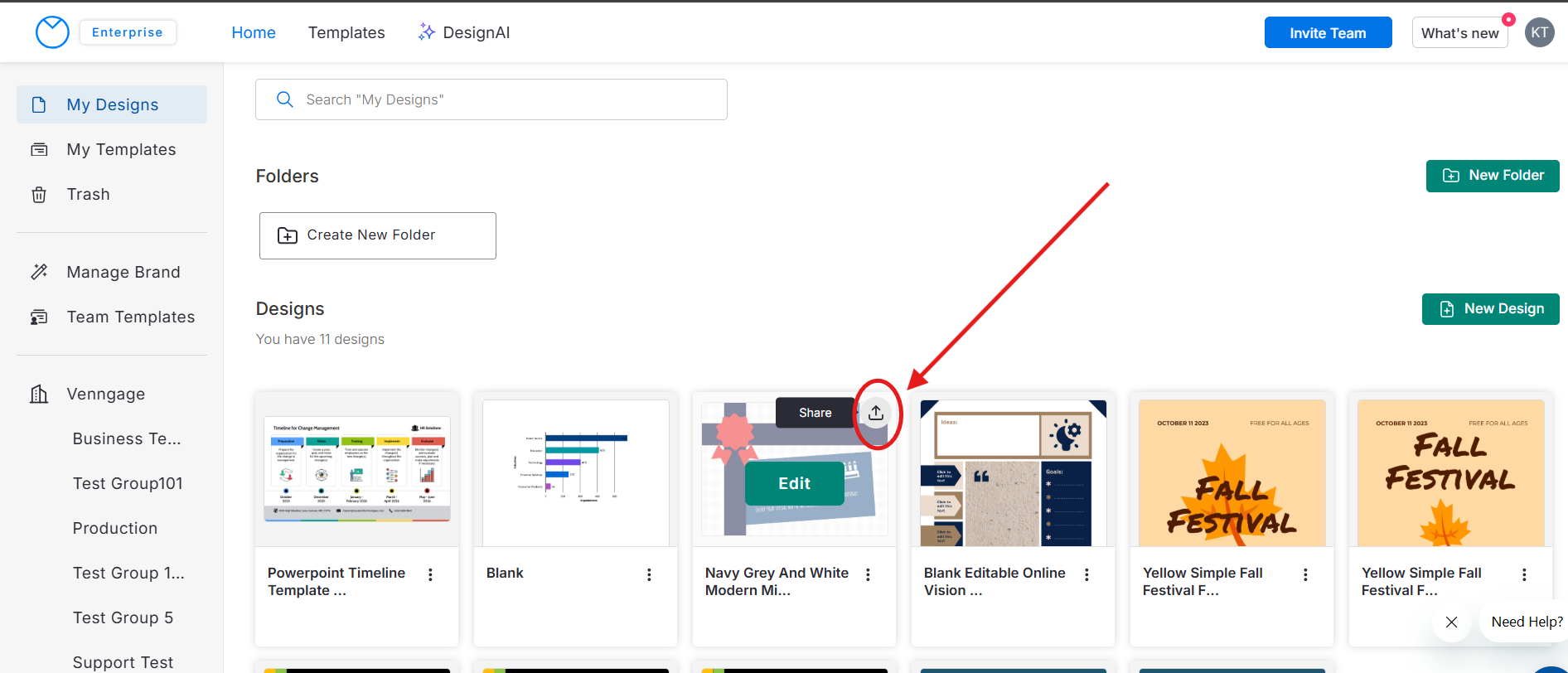 Uma vez compartilhado, seu design aparecerá na página do Grupo na barra lateral esquerda, sob o nome da sua organização.
