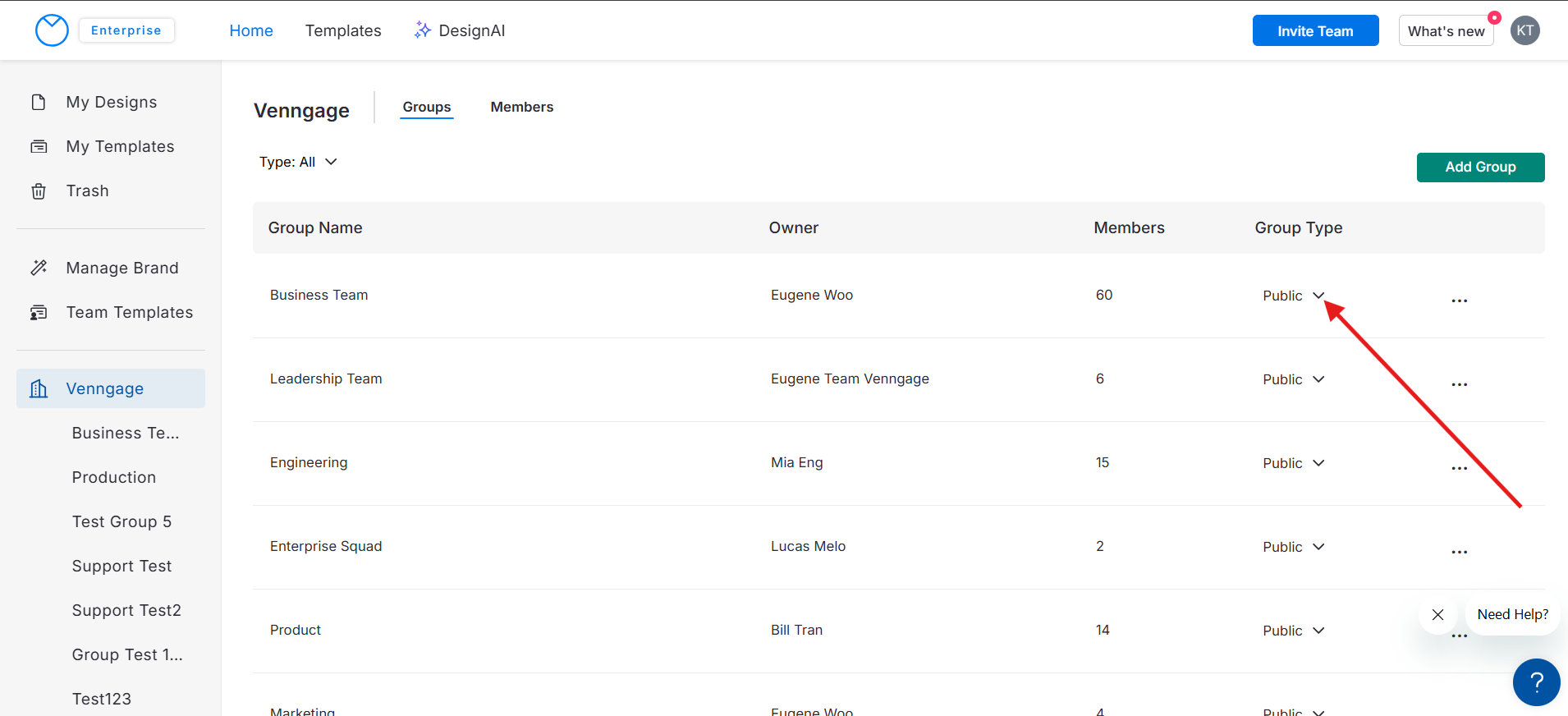 Quando um usuário cria um Grupo, ele escolhe se será Público ou Privado. Como Admin, você tem a flexibilidade de alterar o tipo de Grupo de qualquer Grupo na sua organização — mesmo que você não o tenha criado.
