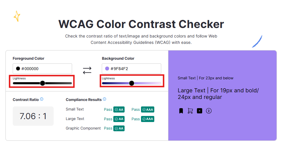 Use o Verificador de Contraste de Cores do Venngage para garantir que o contraste entre seu texto, ícones e fundo esteja em conformidade com os padrões das Diretrizes de Acessibilidade para Conteúdo da Web (WCAG).