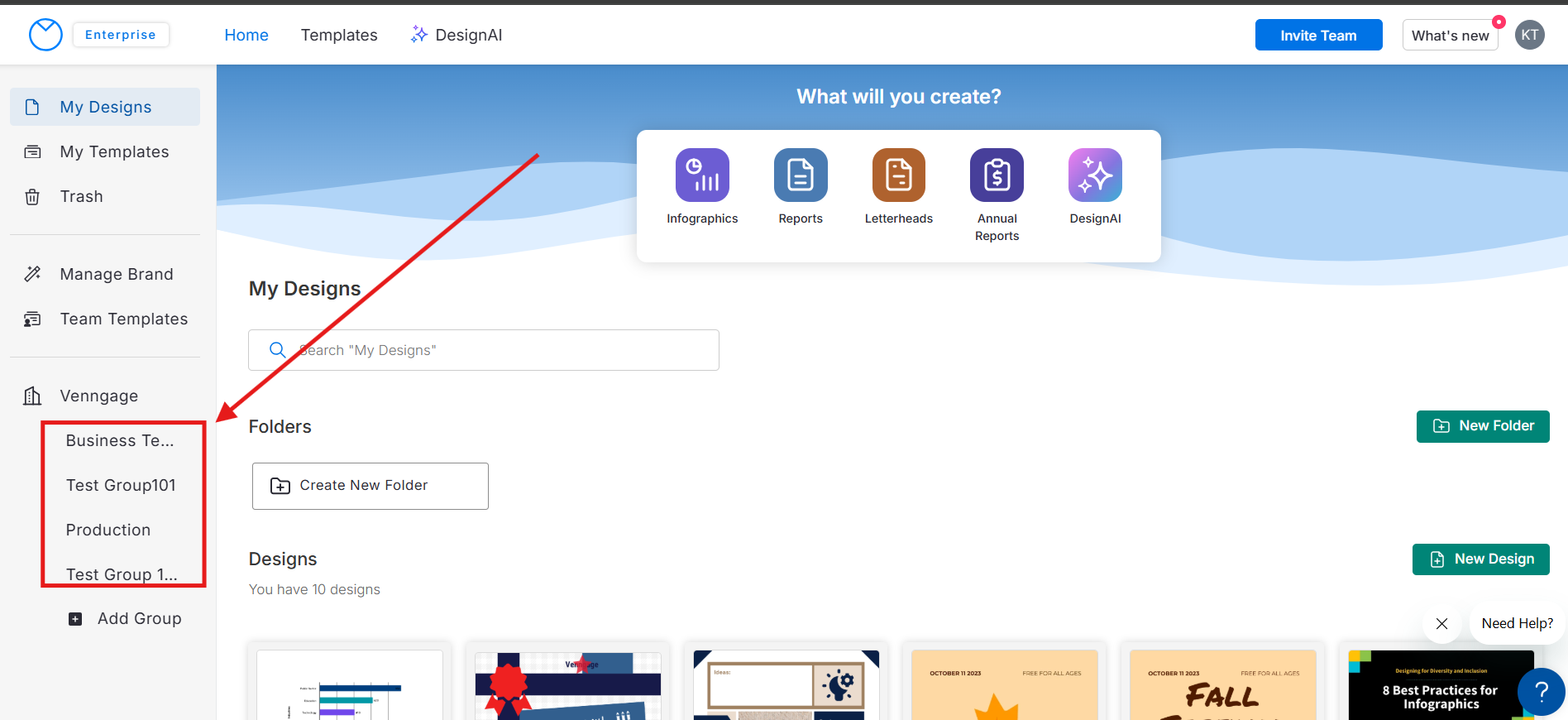 Na página inicial da Venngage, clique no nome do seu Grupo na barra lateral esquerda. Você também pode acessá-lo pelo nome da sua organização na lista de Grupos.