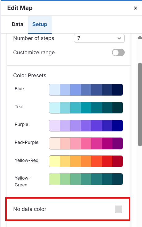 Clique no quadrado ao lado de Cor sem dados (No data color) para abrir a ferramenta de cores.