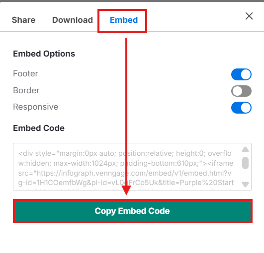 O recurso de Incorporação (Embedding) permite que você compartilhe seus designs do Venngage diretamente em seu site, blog ou outras plataformas online. É uma ótima maneira de exibir relatórios, infográficos ou elementos visuais sem que os espectadores precisem baixar nada.