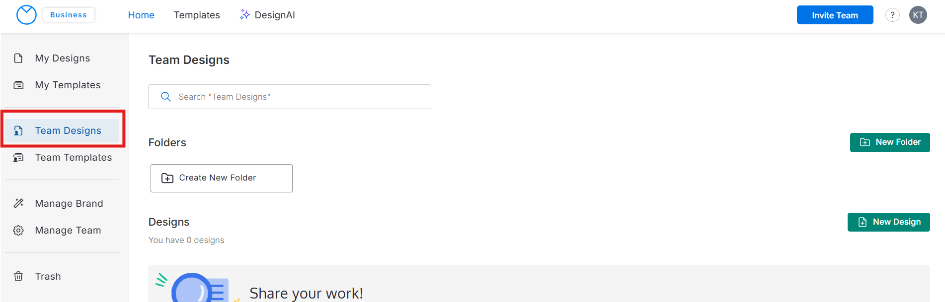 Grupos – mantenha os designs organizados em toda a sua organização. Os Grupos ficam visíveis na barra lateral esquerda, abaixo do nome da sua organização, na seção abaixo de “Templates da Equipe”.